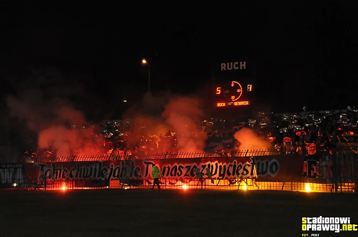 Еще один матч ІІ-ой лиги, на этот раз между «Рухом» и «Ресовией». Фанаты гостей с баннером «Такие минуты - это наша победа» и пиротехникой.