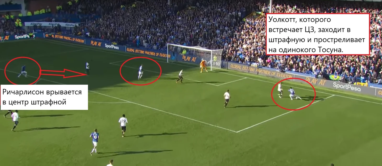 3. Быстрые фланги. Ричарлисон похож на молодого Уолкотта в движении и в обращении с мячом, но гораздо лучше реализовывает моменты. У него уже 4 гола с xG = 2.11. А вот в подыгрыше молодой бразилец выступает гораздо хуже англичанина, у которого 2 гола + 2 голевых в первых восьми турах. Такая статистика объясняется разными функциями на поле. Уолкотт прорывается между левым и левым центральным защитником, затем навешивая либо простреливая. Ричарлисон же часто играет оттянутого форварда.