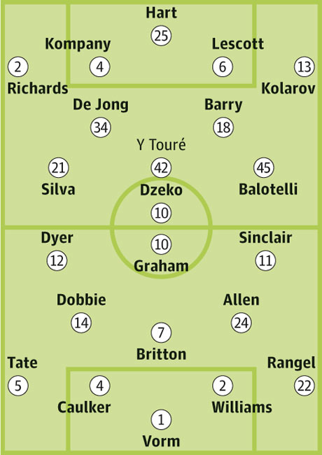 Запасные: Тэйлор, Пантиллимон, Милнер, Сабалета,Клиши, Савич, Гайдетти, Рузак, Райт-Филлипс, Джонсон, Агуэро, Бридж, Онуоха, Адебайор, Тевес