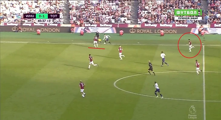 1) Фланги обороны. С одной стороны этот аспект является неплохим плюсом в атаке столичной команды, ведь например в матче с «Манчестер Юнайтед» именно подключение Сабалеты стало результативным для хозяев поля. Точная прострельная передача помогла «молоткам» повести в счёте.
