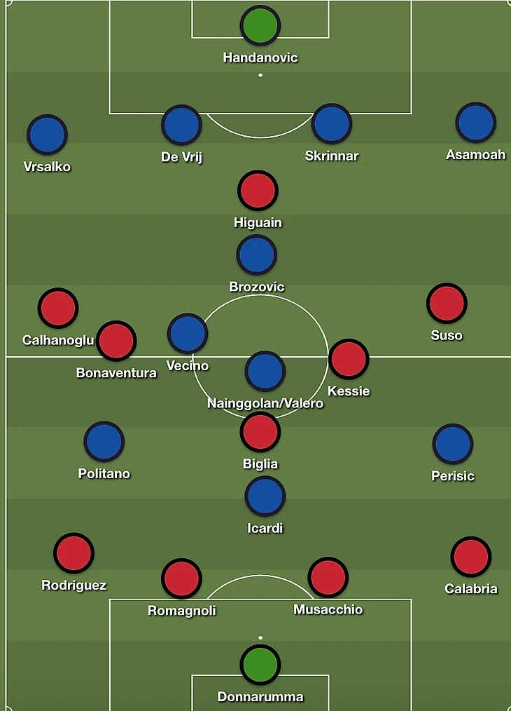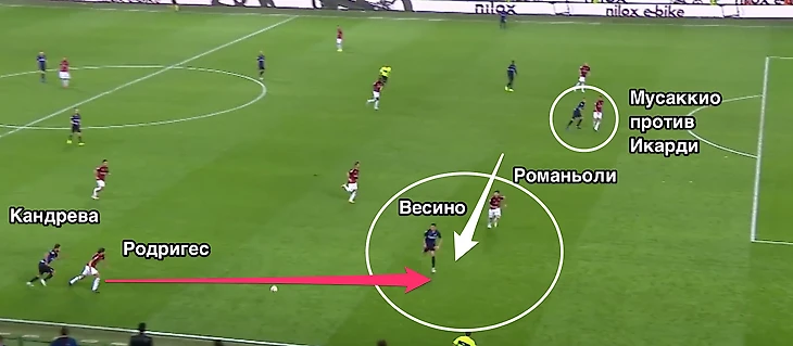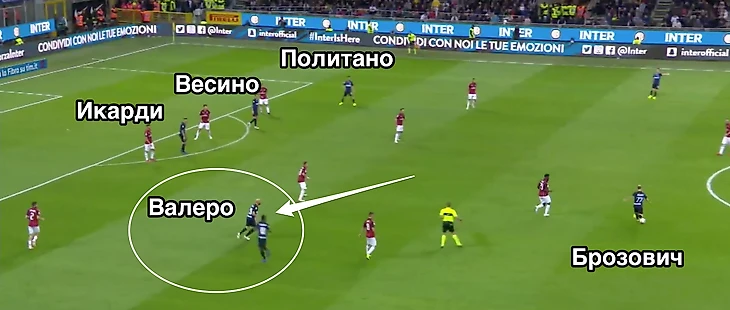 Нельзя не заметить еще то, что футболисты избегали зону в центре перед воротами «Милана», где всегда узко располагались сразу три центральных полузащитника. И вышедший вместо Найнгголана Валеро и Весино (о нем еще отдельно поговорим) старались больше двигаться в направлении бровок, вылавливая свободные зоны.