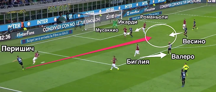 И Весино набрал свои удары не случайно. Спалетти использует Матиаса как еще одну опцию в нападении при фланговых передачах. Три из своих четырех ударов Весино нанес именно из штрафной площади, пользуясь тем, что основное внимание защитников всегда сосредоточено на Перишиче и Икарди.