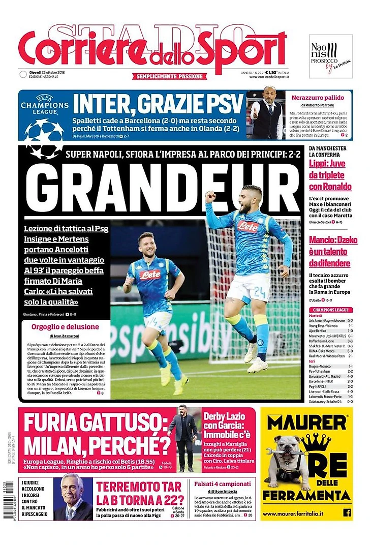 Супер «Наполи», упущен успех в «Парк де Пренс»: 2:2. Тактический урок для «ПСЖ». Инсинье и Мертенс дважды выводили Анчелотти вперёд. На 93 минуте издевательство в виде ничьей после гола Ди Марии. Карло: «Их спасло лишь качество».