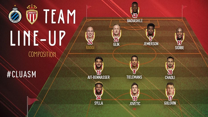 Монако использовал схему 4-4-2 при обороне. Диоп и Силла прессинговали строго центральную ось. Брюгге часто атаковал по левому флангу и Головин, находящийся как раз справа, точечно выдвигался для прессинга в линию нападающих и схема трансформировалась в 4-3-3.