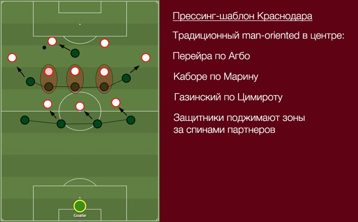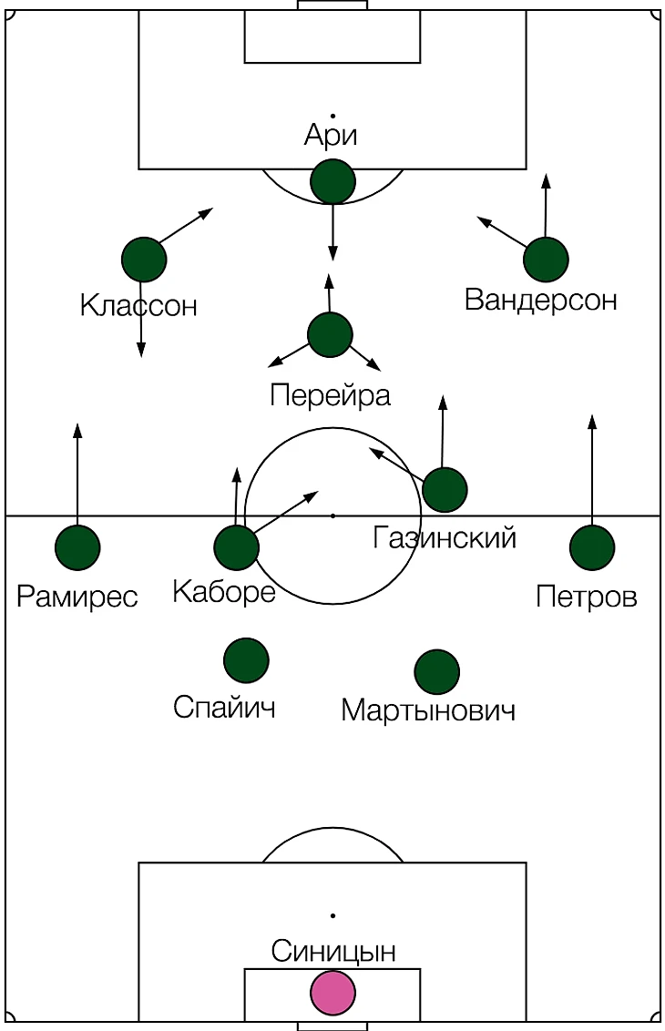 При всей клубной любви к владению, очевидно, что Краснодар Мусаева гораздо опасней, когда соперник не прочь покатать мяч сам. Мурад Олегович уже озвучивал мысль, что более вертикальный футбол Юргена Клоппа ему ближе, нежели чистый Juego de Posición Гвардиолы. В первом тайме Краснодар показал, как может работать гегенпрессинг по-мусаевски. Быки не слишком дорожили мячом в начальной стадии атаки (всего 46% владения в первые 45 минут), предпочитая стерильному владению длинные забросы на Ари за спины защитникам. Этим промышляли и Спайич, и Газинский, и Каборе, и Перейра.