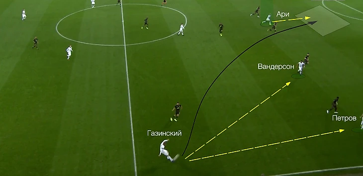 3. Ориентированность на центральную зону. Грустная фланговая игра с массой однообразных кроссов в матче с Ахматом – явно не то, что хочет видеть Мусаев. Со Стандардом Краснодар старался использовать центр как основной фронт атаки. Главный адресат – все тот же Ари.