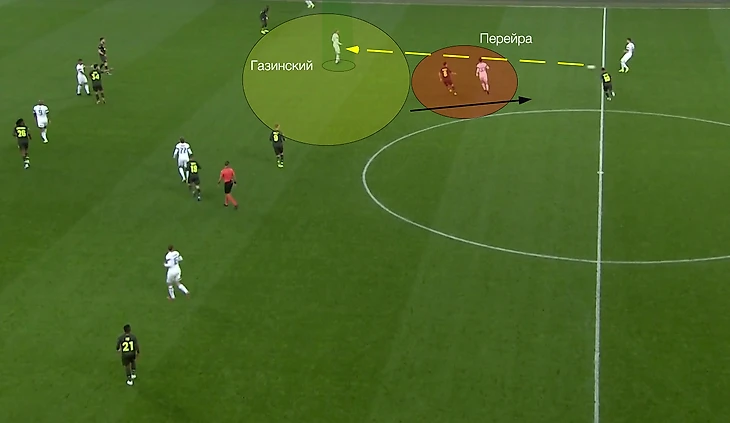 Перейра стягивает на себя Цимирота. Газинский свободно принимает мяч в полуфланге
