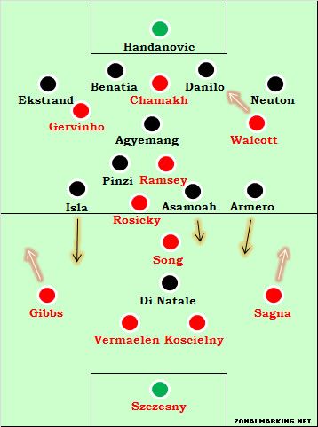 «Арсенал» использовал крайне гибкую схему 4-3-3, причем в передней линии постоянно происходила ротация всех трех игроков, а футболисты из трио полузащитников также, по очереди, шли вперед. Томаш Росицки действовал в более глубокой роли, и, казалось, там он смотрелся более комфортно и больше времени владел мячом, тогда как Аарон Рэмси был самым выдвинутым вперед полузащитником – и он создал ранний гол для Тео Уолкотта, после удачного прорыва вперед.