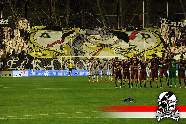 Спустя 2,5 года "Барселона" возвращается на "Эстадио-де-Вальекас". Предыдущий приезд каталонцев "Буканерос", крупнейшая фанатская группировка Вальекаса, встретила баннером с надписью с изображением белого коня на гербе "Райо Вальекано".