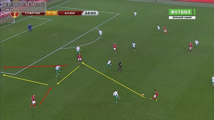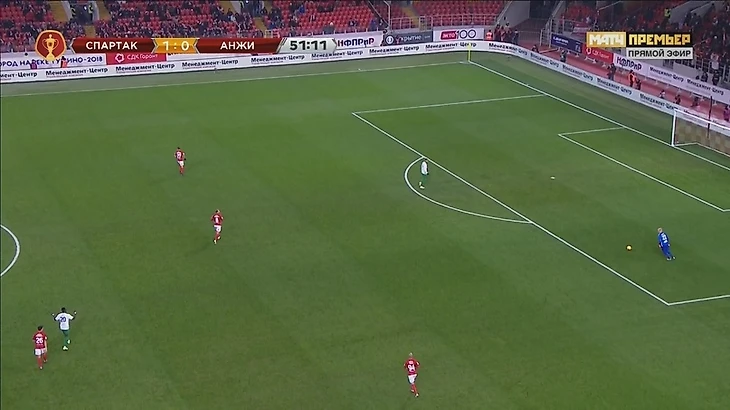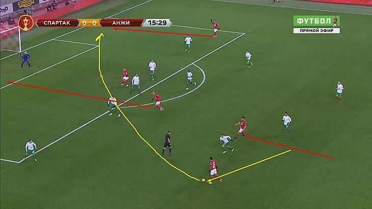 Дальше Спартак неплохо контролировал мяч, разыгрывал его перед штрафной, умело отдавал в некоторых эпизодах инициативу, но ничего по-настоящему опасного больше не создал в первом тайме. При этом продолжал использовать пространство на фланге, которое давало Анжи: