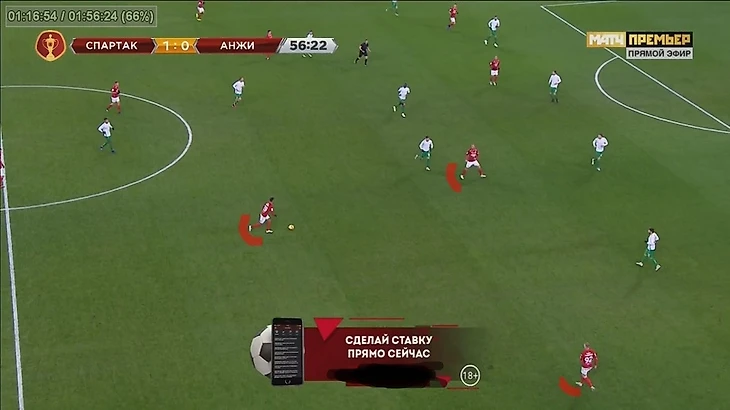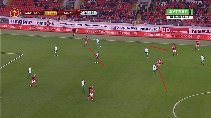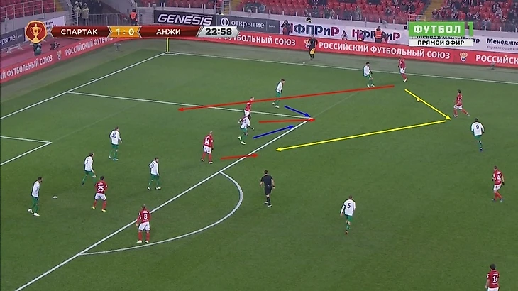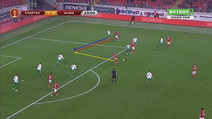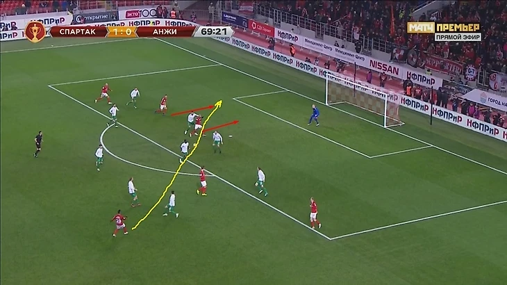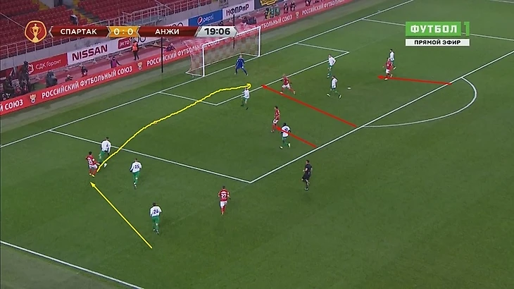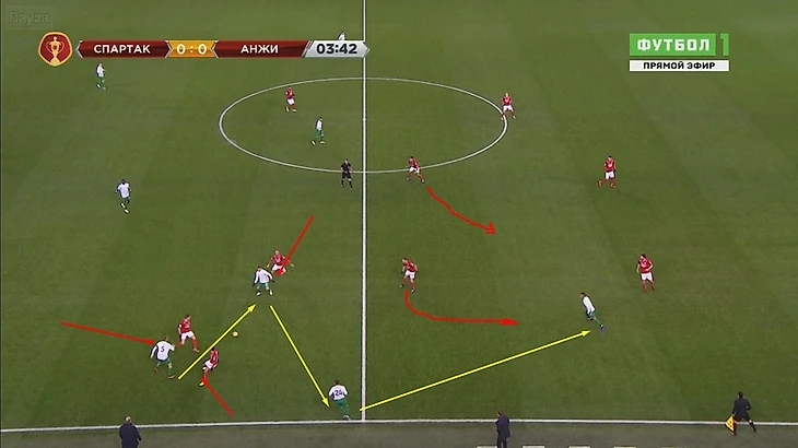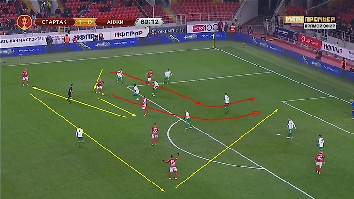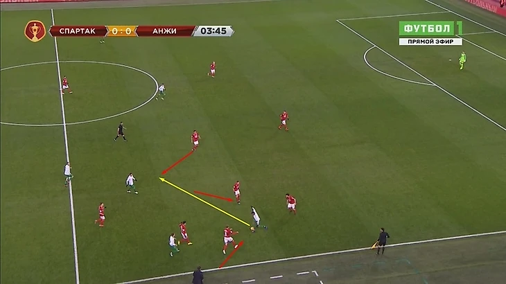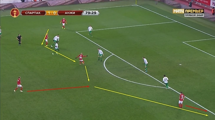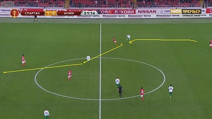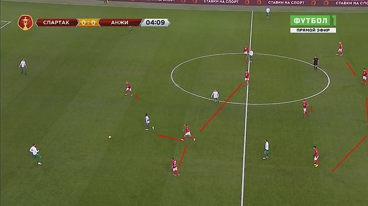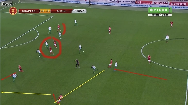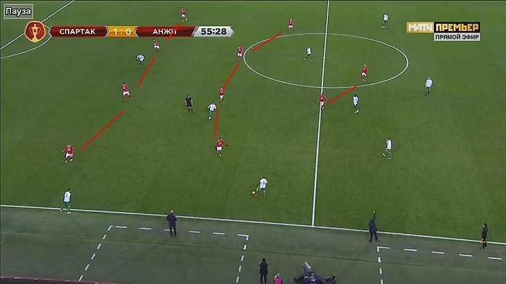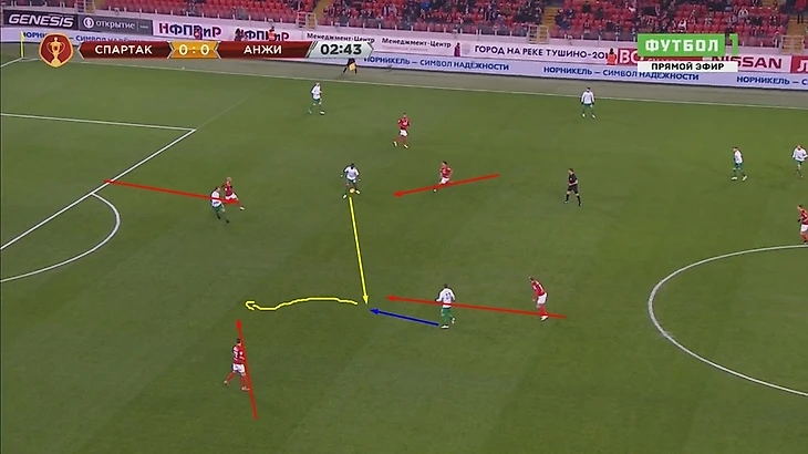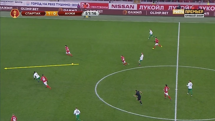 Обращаем внимание насколько широко и неплотно располагается Спартак во время всей этой атаки Анжи первом пасом были отрезаны Глуш-Ханни-Ломо. Во второй линии огромные разрывы между спартаковцами из-за того, что не успели вернуться 2 игрока. При этом игроки в линии не стали сдвигаться к флангу, на котором находится мяч. В итоге ещё 3 игрока никак не влияют на происходящее. Ну а дальше уже Рассказов внёс свой вклад:
