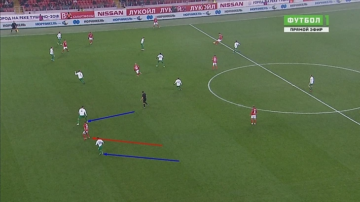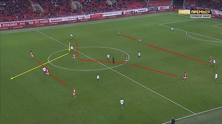 Тем не менее высокий прессинг команда демонстрировала не на постоянной основе и предпочитала, опять же как и в последних матчах, отходить назад перестраиваясь в 4141 при обороне. Плюс к этому, Глушаков, как ранее до этого Зобнин, был тем самым игроком, кто первым из линии полузащитников начинал прессинг