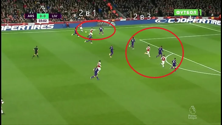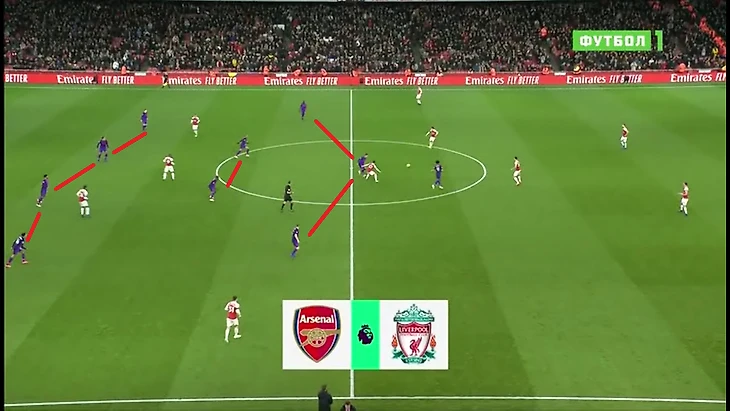 Позиционный прессинг команды Клоппа подразумевает, что при выходе соперника из обороны три нападающих перекрывают возможные линии передач, вынуждая соперника выносить мяч. Но Арсенал очень легко разбивал этот прессинг по причине того, что Бернд Лено прилично играет ногами и доставляет мяч до одноклубников с помощью коротких и средних пасов очень качественно и надежно.
