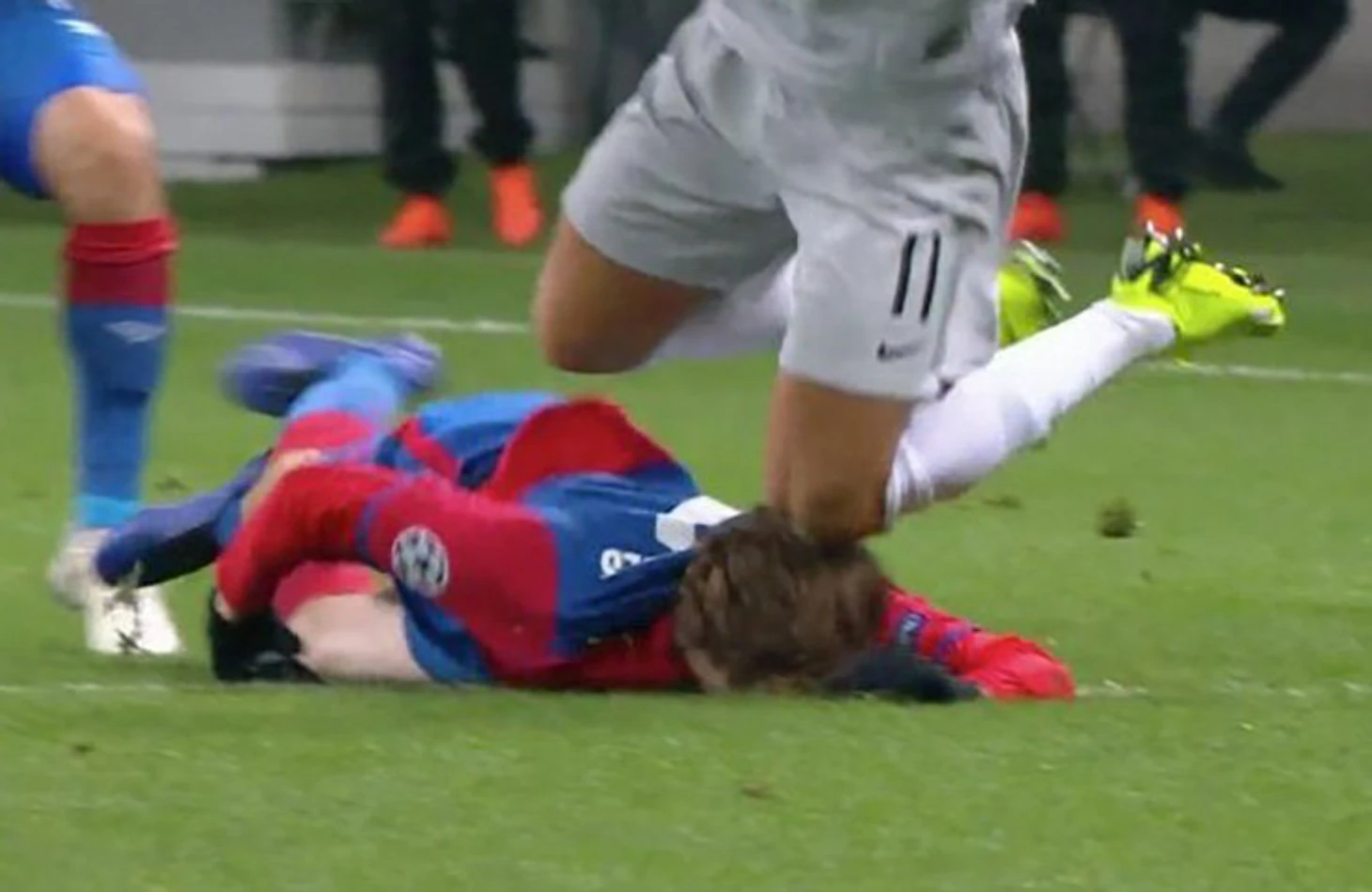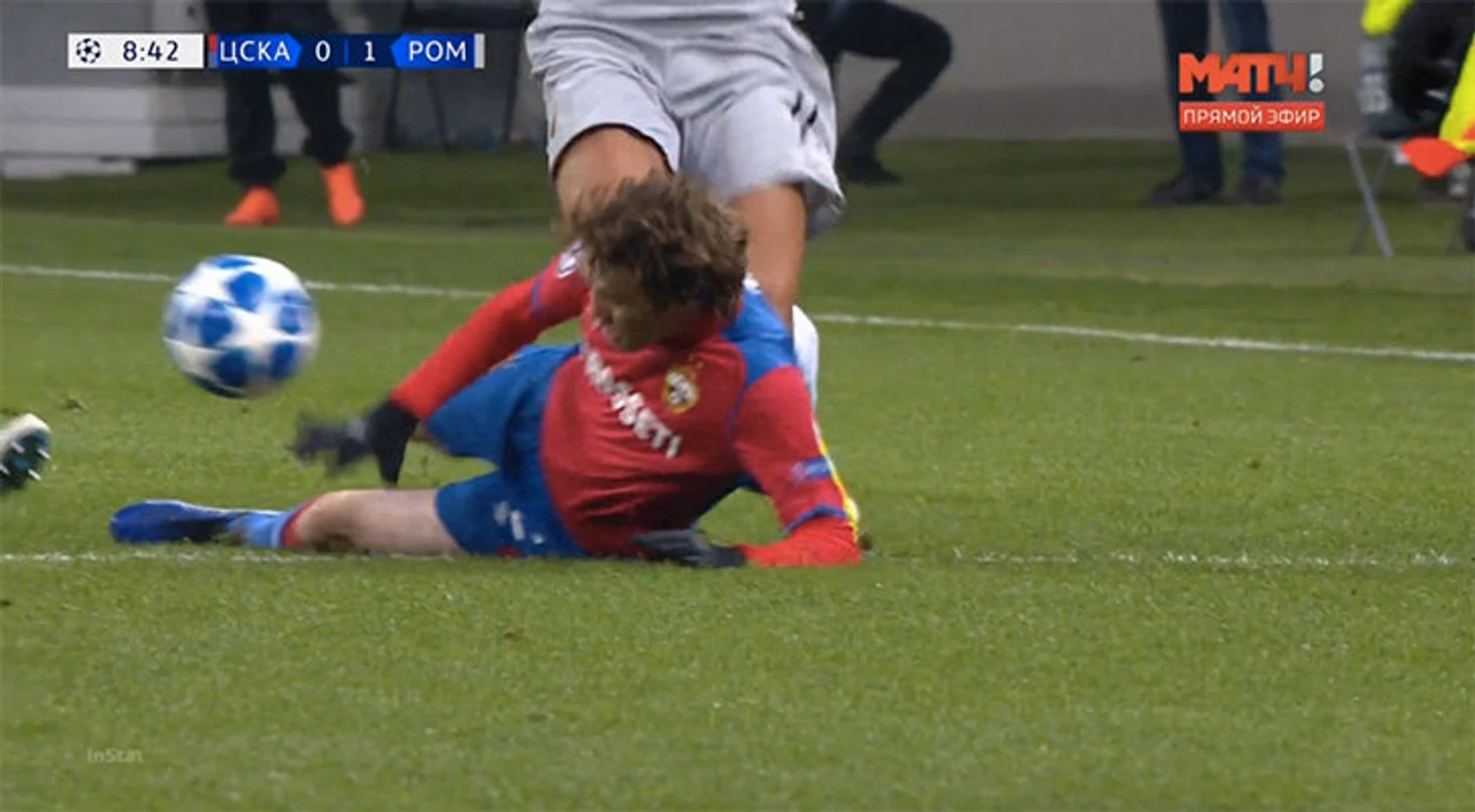 В момент столкновения игрок ЦСКА уже лежал на газоне спиной к сопернику.
