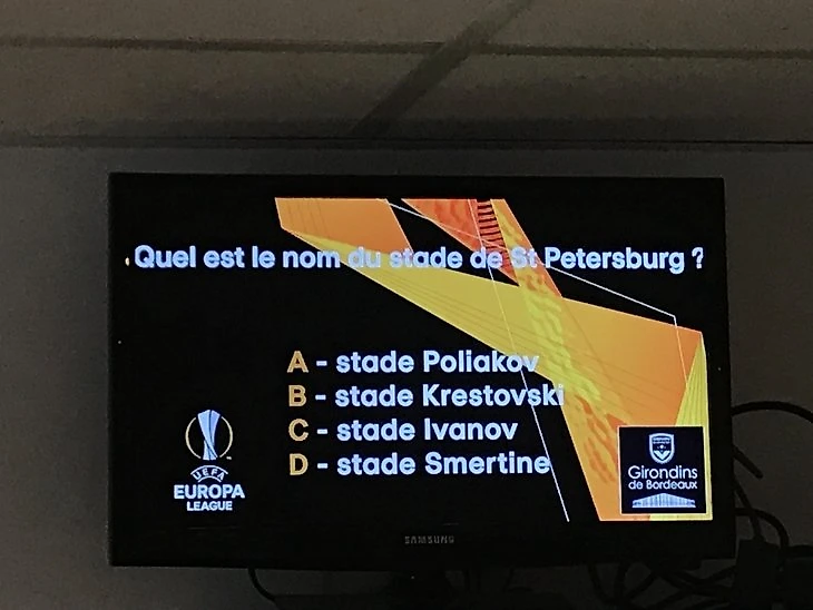 За сорок минут до игры по экранам стадиона «Матмют Атлантик» разлетелся опрос: «Как называется арена в Санкт-Петербурге?». Кто такой Поляков французы не объяснили, зато Алексея Смертина вспомнили все (116 матчей за «Бордо» с 2000-го по 2003-й).
