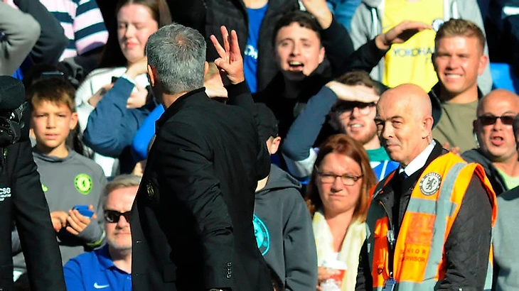 Магические три пальца португальца на этом не закончились. После огненной концовки в матче с "Челси" помощник Маурицио Сарри Марко Ианни побежал праздновать гол перед скамейкой "манкунианцев", что взбесило Жозе. Ну а что остается делать фанатам? Правильно, оскорблять главного тренера "Манчестер Юнайтед". И что мы имеем? Жозе снова вынудили это сделать. Он напомнил болельщикам "синих", сколько раз брал титул АПЛ с "Челси". Напомнил то, что необходимо помнить историю своего клуба.