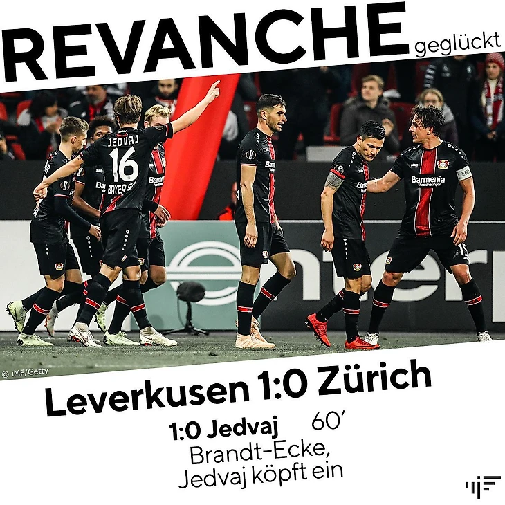 Второй тайм начался дымовым представлением от гостей, неиллюзорно напомнившем о минувшем матче «Спартака» с «Рейнджерс» – впрочем, ужасно не хотелось верить, что и все голы на сегодня достанутся в основном противостоянию в Тушино. Лишь на 51 – ой минуте гости получили свое право на угловой – но Стивену Одею не удалось забить удачно принятый мяч с центральной точки. Первая замена также была за цюрихской командой – Виктор Пальссон сменил Салима Хелифи. «Байер» же на 58-ой минуте лишился возможности задействовать Доминика Кора в следующем матче – неистовый немец получил «горчичник» в упрямой борьбе с косоваром Крюэзиу. Наконец, на 60 – ой минуте после очередного корнера, разыгранного Юлианом Брандтом, Тин Едвай уверенно принял мяч головой, в то время как Брехер неожиданно растерялся — шаг вперед, два назад! Юный хорват повернулся в прыжке и бойко послал мяч в сетку с пяти метров. 1:0 — открытия счета пришлось ждать почти две трети матча. В целом «Байер» действовал довольно статично, хоть и превосходил гостей чисто визуально.