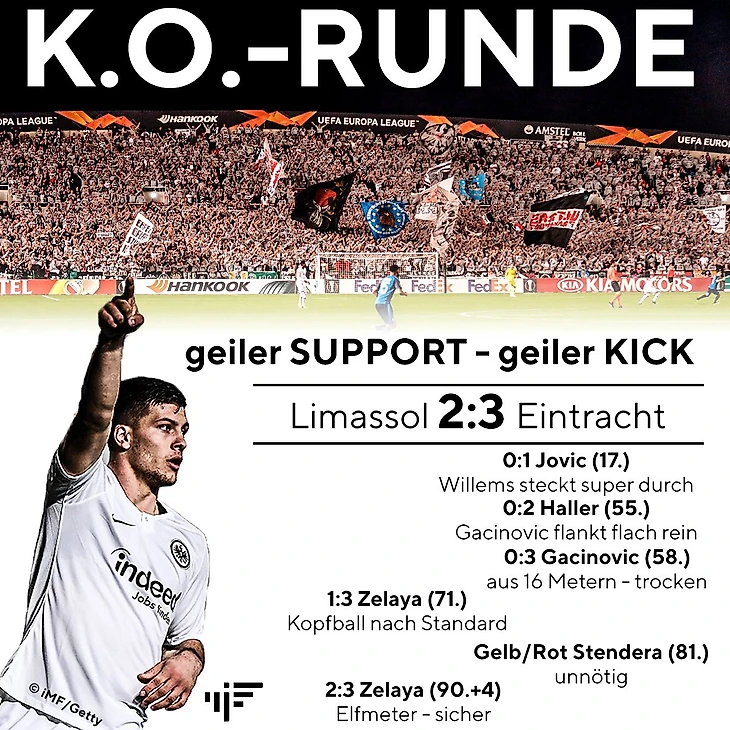 К этому матчу как нельзя лучше подходит понятие «обыграли на классе». Сыграв в атакующий футбол в общей сложности минут 15 – 20 от общего хронометража, которые и позволили создать комфортное преимущество, «Айнтрахт» старался минимально тратить силы и максимальное внимание уделял исключительно контролю соперника. И если во Франкфурте статистика ударов по воротам была со значительным перевесом в пользу «орлов» — 23:7, то в матче на Кипре этот показатель был в пользу «Аполлона» — 13:11. И вкупе со счётом эти цифры дают достаточное представление о матче.