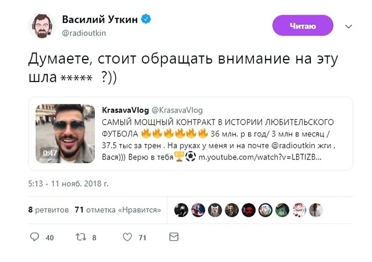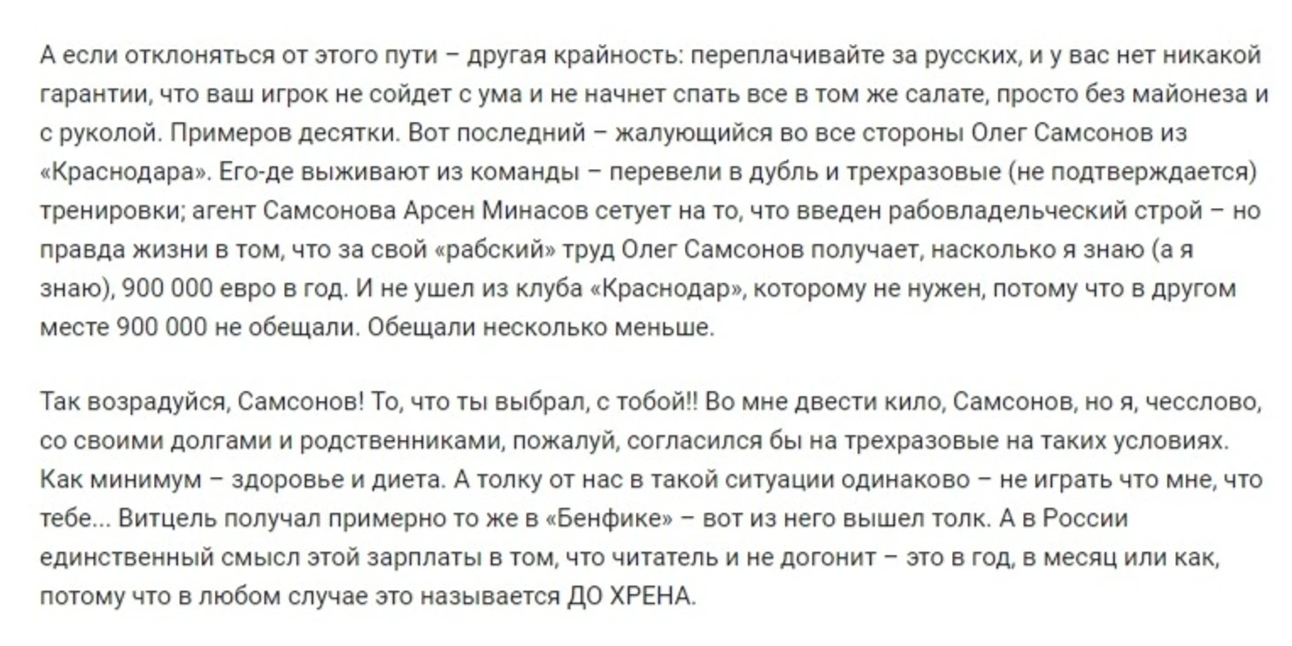 Самсонов просит журналиста ответить за слова: в 2012 году Василий опубликовал в блоге на Sports.ru пост «Нам такой лимит не нужен», в котором был такой абзац: