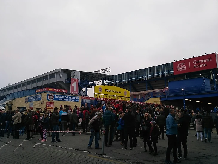 Перед стадионом напряжение совсем не ощущается. Народ спокойно сидит у «Макдональдса», стоит в очереди в кассу за билетами (солдаут, но надежда всегда есть!), фотографируется на фоне классного граффити. Мимо проходит девушка с шарфом «Гриффиндора» – многие ей улыбаются, цвета факультета из «Гарри Поттера» напоминают кирпичные «спартанские». Перед стадионом всё настолько тихо и спокойно, что практически не видать полицию. Другое дело – на трибунах. Здесь освистывают всех игроков, тренеров и вообще всех-всех-всех, кто имеет отношение к пражской «Славии».