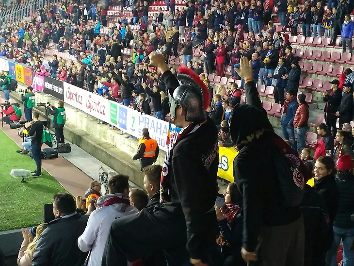 Сектор «славистов» полностью забит ещё за час до свистка – «спартанцы» только подтягиваются. Видя такое численное превосходство, фаны «Славии» начинают петь. Болельщики «Спарты» возмущаются, пытаются отвечать, но их пока маловато. На помощь приходят сотрудники стадиона, которые сразу же на полную громкость включают музыку.