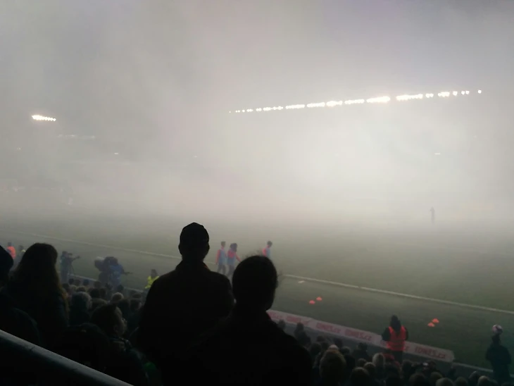 Фаны «Славии» зажигают такие же красные шашки к 35-й минуте. Ещё через минуту «Славия» забивает, приводя их в восторг. Шумная «Дженерали арена» на мгновение замолкает, но когда децибелы «славистов» превышают все вежливые для гостей значения, фанаты «Спарты» тут же заводят: