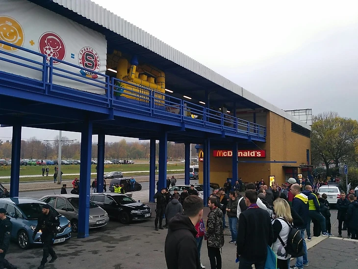 А вот «Спарта» играет на арене, которая выглядит так же, как и сотню лет назад. Реконструкция такая простая и незатейливая, что на фотографиях пражской «Спарты» 1920-х отчётливо узнается нынешний стадион. Он вообще необычен. Например, внутри арены можно купить бургер в «Макдональдсе». Само заведение находится за пределами стадиона, но к нему подвели специальную террасу на втором этаже – и да, она в самом деле выходит за пределы стадиона.