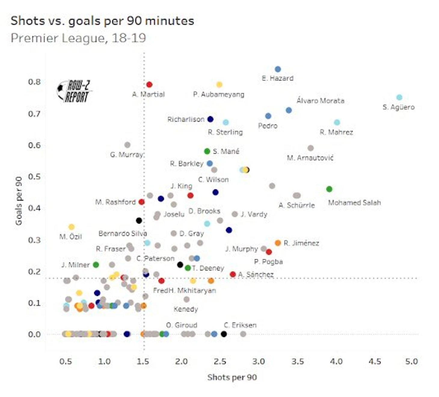 Лучшие игроки АПЛ по среднему количеству ударов и голов за матч.