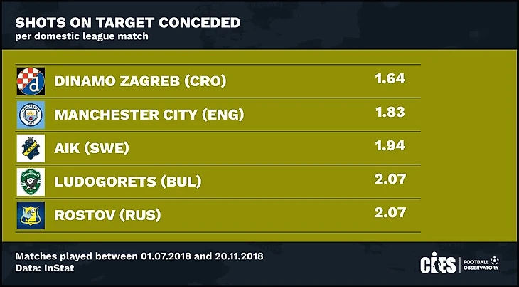 Лишь один российский клуб попал в первую десятку одного из таких рейтингов. «Ростов» — занимает пятое место в Европе по наименьшему в среднем за матч числу допущенных в створ ворот ударов. В среднем за игру соперники наносят в створ ворот команды Евгения Карпина 2,07 удара за матч. Лидером по данному показателю является загребское «Динамо» — 1,64 удара за матч.