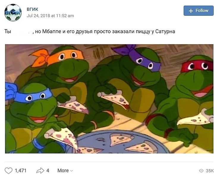 – Какой-то пользователь, допускаю, что подписчик «ВГИКа», написал «Сатурну», чтобы ему доставили 4 пиццы, картошку и соус. «Сатурн» ответил. Потом начали писать всем клубам. «Анжи» писали про шашлык, например. «Химки» – молодцы, поддержали это. Пообещали вручить пиццу даже одному пользователю – и так и сделали. Потом акцию с пельменями провели, там тоже все прошло хорошо. Вот так вся эта история вышла на большие масштабы. Были даже мемы с «Черепашками-ниндзя» и Мбаппе. Были картинки про «Спартак» и пиццу. А все началось с одного сообщения.