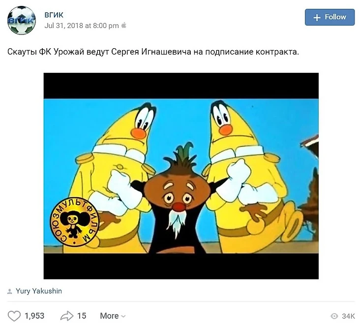 Могу еще вспомнить мемы про клубы вроде «Урожая». Когда мы публиковали кадры из мультика «Чиполлино» и писали, что это ультрас «Урожая». Про то, что клуб строит арену на миллиард мест. Бартош Капустка перешел в «Урожай». Это банально, конечно, но все равно смешно. Людям нужен только повод – дальше фантазия бьет ключом.