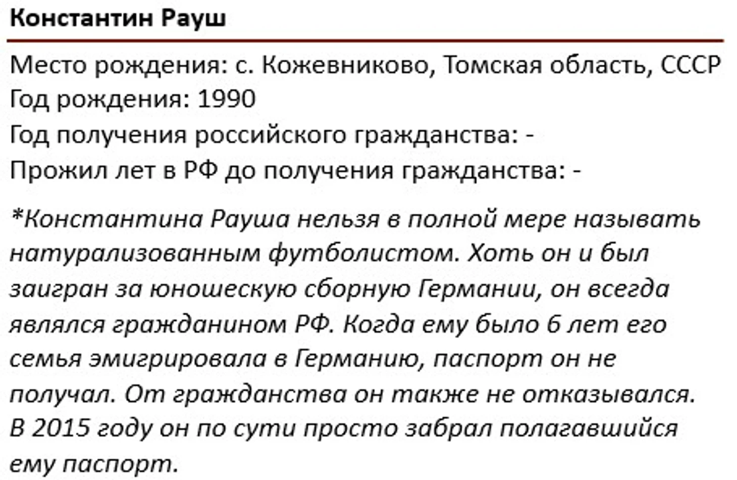 Как видно из сказанного выше, разница между натурализованными футболистами заключается не только в их национальности и месте рождения, а еще и в том, благодаря какому механизму они стали гражданами РФ.