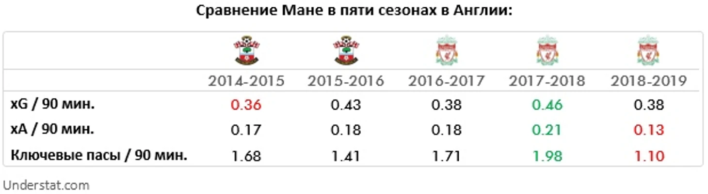Клопп прав – за последние два сезона Мане очень вырос как игрок, прибавил в понимании футбола, поменял роль на поле и научился делать вещи, которые не показывал ни в «Саутгемптоне», ни в «Зальцбурге». Но этот сезон – однозначно худший из тех, что у него были в Англии. Это легко увидеть, проанализировав его статистику за пять сезонов, которые он провел в АПЛ.
