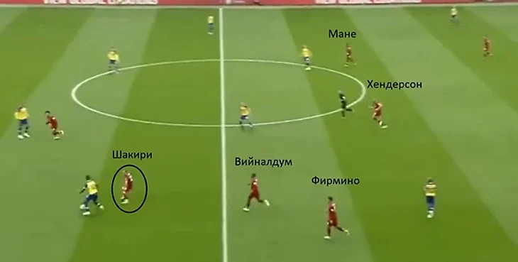 Шакири выбрасывается в прессинг, хотя должен находиться между Хендерсоном и Мане. Через несколько секунд «Саутгемптон» окажется 3-в-2 на правом фланге защиты «Ливерпуля».