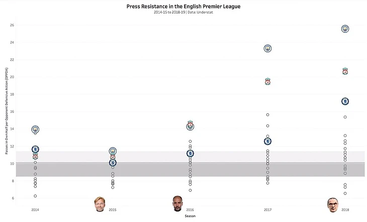 Клопп, Сарри и Гвардиола выводят игру под прессингом у своих команд на принципиально новый уровень. За последние пять лет не было случая, чтобы одна или несколько команд настолько доминировали над всеми остальными в лиге в этом компоненте – но теперь это норма. При этом видно насколько изменился стиль Челси с приходом Сарри, и добавлением в состав Жоржиньо – последний является одним из лучших игроков в мире при игре под давлением. В прошлом сезоне Челси был худшим клубом топ-6 по этому показателю. Год спустя, Челси полностью изменился: