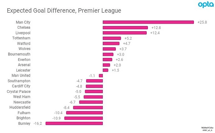 Нынешний сезон в Англии не похож на другие. За столько сезонов в АПЛ мы как-то привыкли, что борьба за титул АПЛ всегда напряженная, и ничего не ясно до последних туров. Так было, как минимум, до прошлого сезона, но скорее всего, в этом сезоне все пройдет по похожему сценарию. Несмотря на то, что разрыв между командами в верхней части таблицы не так велик, по качеству игры три коллектива выглядят ощутимо лучше других. Так, Манчестер Сити, Ливерпуль и Челси имеют с отрывом лучшую разницу ожидаемых забитых и пропущенных голов: