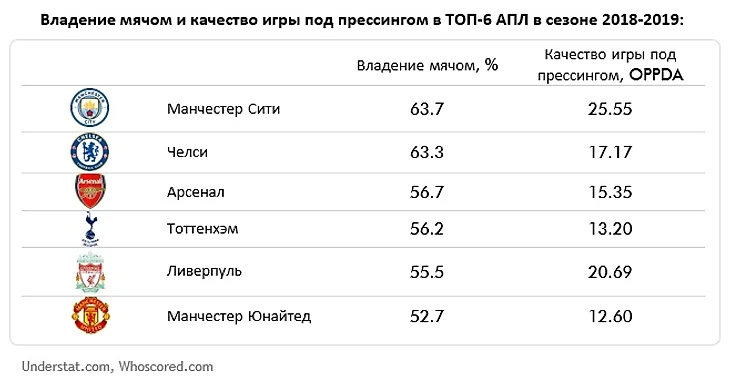 На интуитивном уровне, чем меньше точных передач позволено сделать команде соперника, тем лучше прессинг конкретной команды. Соответственно, чем больше пасов без потерь мяча совершает команда, тем она лучше играет под прессингом. Гвардиола, Клопп и Сарри сделали так, что их команды практически бессмысленно прессинговать – в этом сезоне их команды лучшие в АПЛ в игре под давлением. При этом стоит различать игру под прессингом и владение мячом – первое не всегда адекватно раскрывает второе. Так, например, Ливерпуль в среднем владеет мячом хуже, чем Арсенал и Тоттенхэм, но ощутимо лучше играет под прессингом соперника: