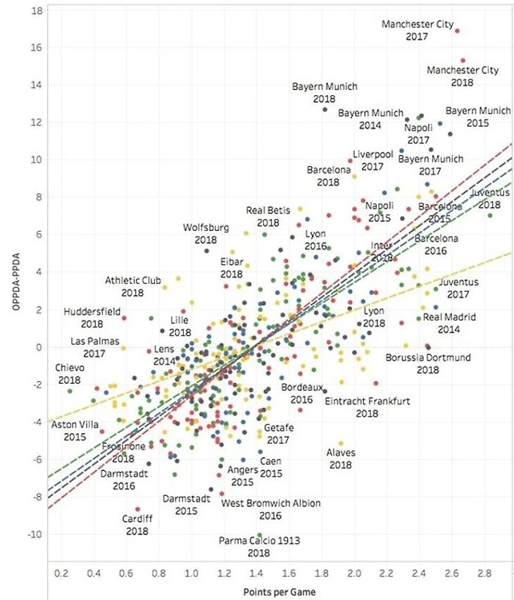 По горизонтали – количество очков в среднем за игру в сезоне. По вертикали – качество прессинга и игры под прессингом, которое рассчитывалось как OPPDA–PPDA. Разность между средним OPPDA за сезон и средним PPDA сезона дает нам числовую интерпретацию баланса прессинга.