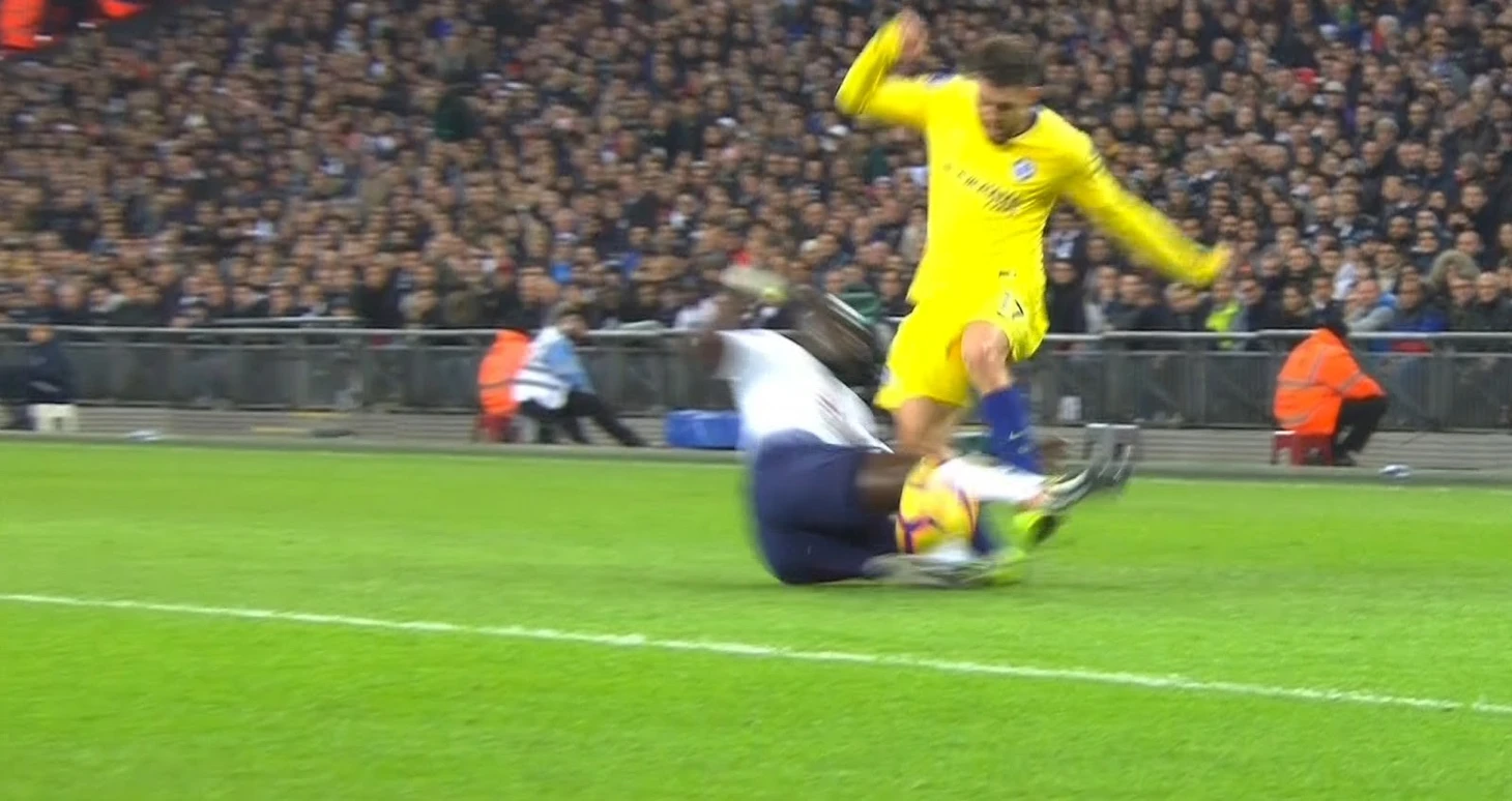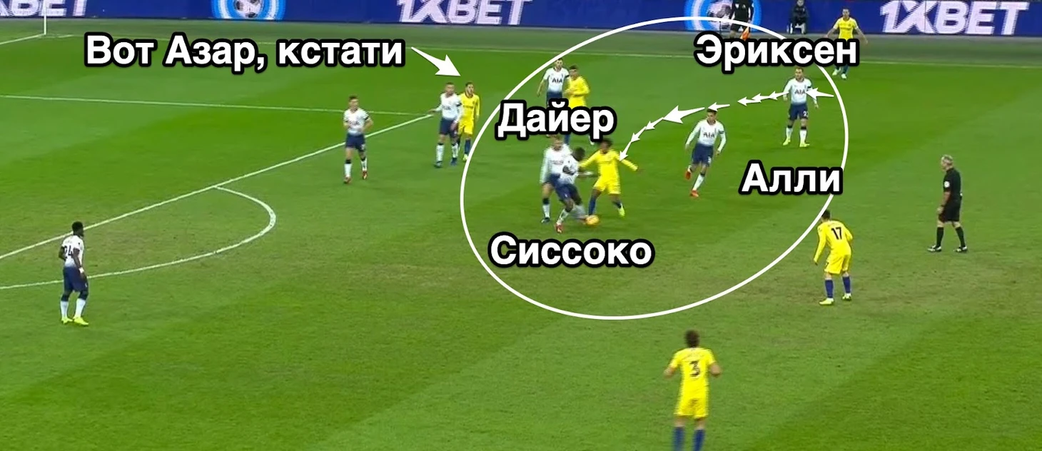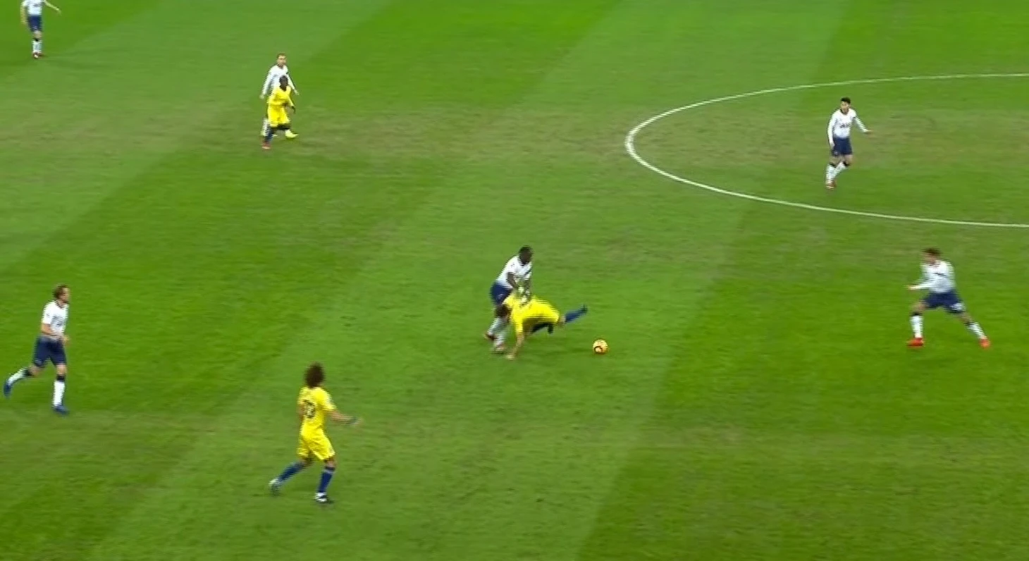 Первый гол стал плодом сумасшедшего прессинга, о котором мы дальше поговорим. А вот второй гол уже стал квинтэссенцией того, что происходило на поле остальные 80+ минут: Виллиан в очередной раз уперся в тройку вышеупомянутых полузащитников «Тоттенхэма», которые в очередной раз стеной стояли перед своей штрафной. Первых двух бразилец даже сумел пройти, но третий (какой же все-таки Сиссоко здоровый!) выцарапал мяч и начал голевую атаку своей команды.