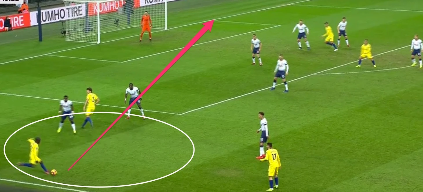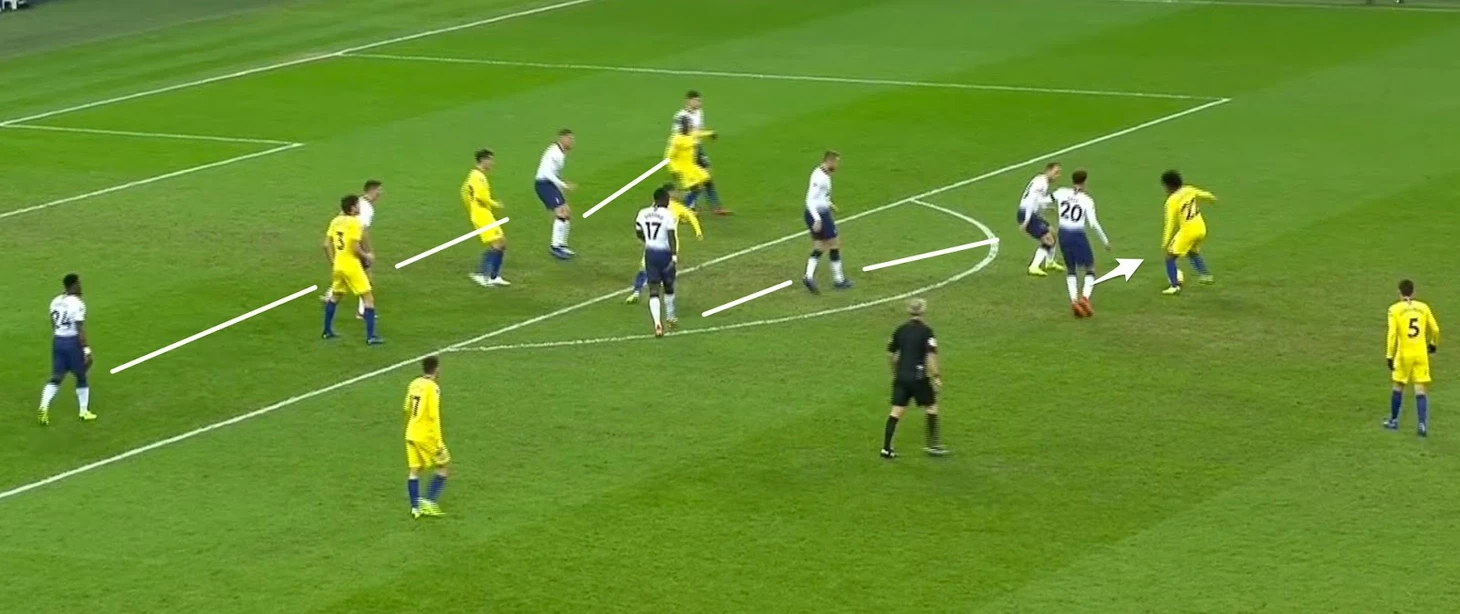 Но самая большая опасность для хозяевов пряталась в активизации крайних защитников «Челси». Даже до гола Жиру гости создали несколько убойных моментов после проходов Алонсо, но не смогли их реализовать. Крайние защитники «Челси» во втором тайме все чаще и чаще ходили вперед ради навесов и именно после одного из таких походов свой гол «Челси» и забил свой гол. Обратите внимание на огромное пространство на противоположном фланге: все игроки «Шпор» продолжали охотится за тройками нападающих и полузащитников, привычно сбившихся на один клаптик поля.