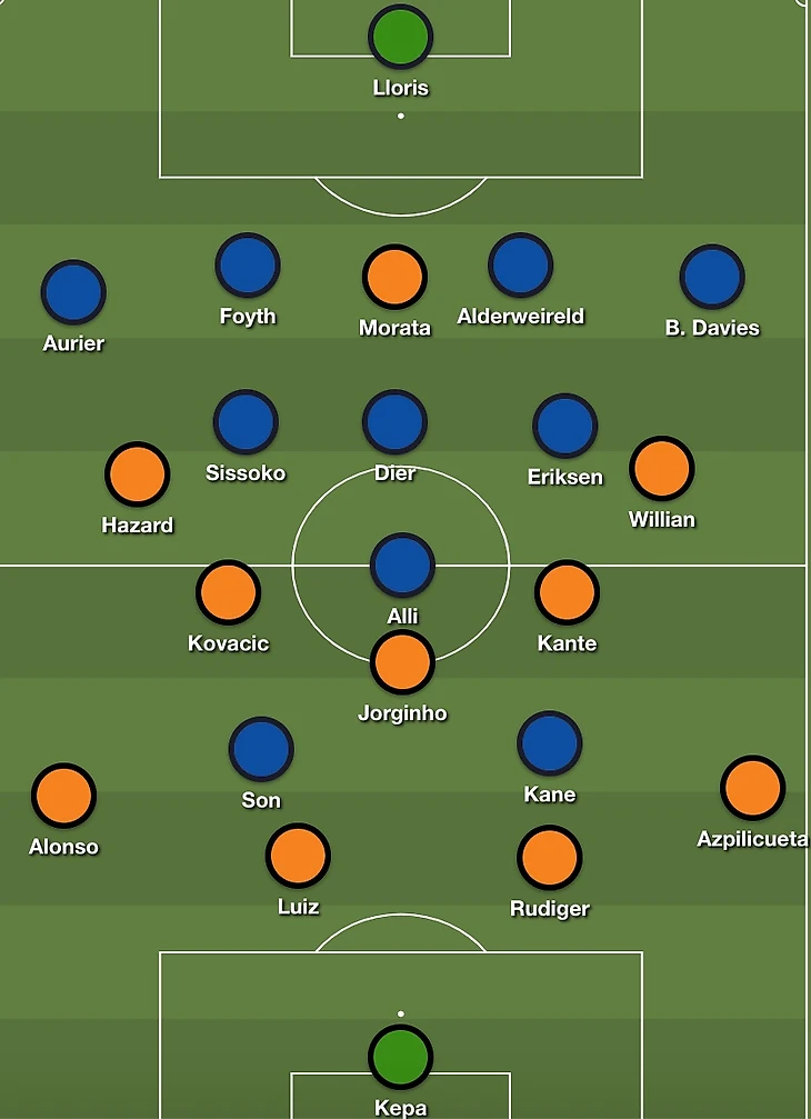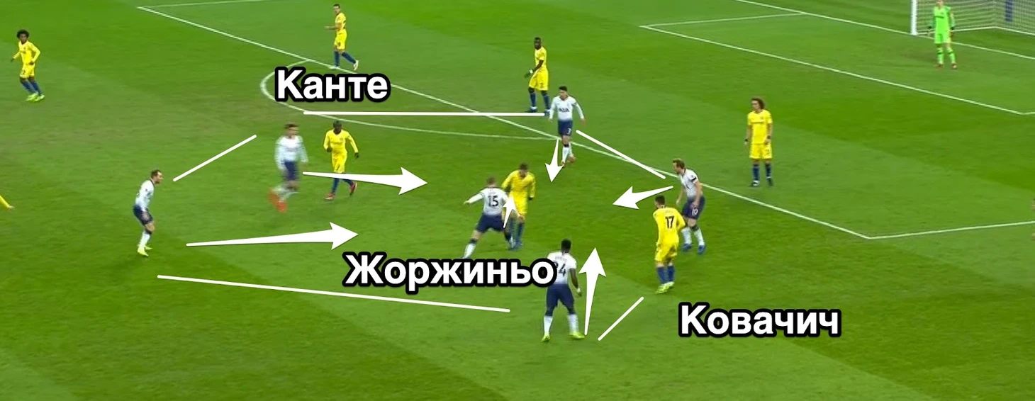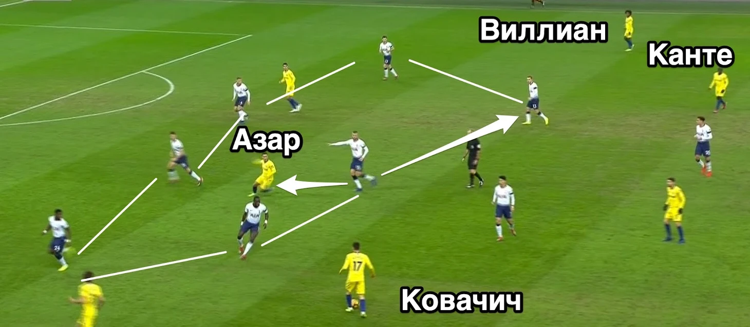 Азар и Виллиан снова сыграли максимально близко к центру, но у Почеттино очень кстати в загашничке оказалась схема 4-3-1-2. Играя ромбом, «Тоттенхэм» получил максимально насыщенный центр поля, где, кроме упомянутого Алли, были еще три центральных полузащитника, готовых разорвать любого, кто приблизится к их воротам.