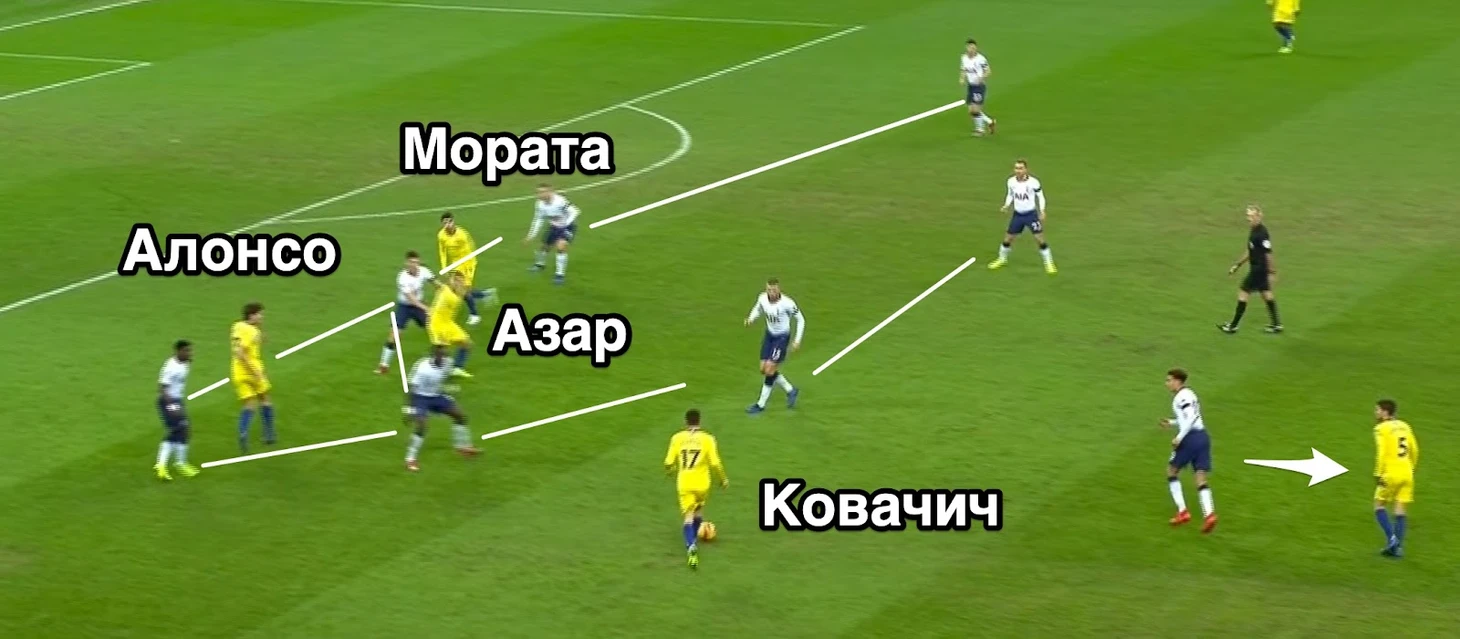 Думаю, про уязвимость этой схемы Ттх на флангах Почеттино знал, поэтому Сон с самого начала играл с Алонсо. Но в чем одна из проблем Челси - Аспиликуэта не очень хорош в атаке, поэтому его можно было так плотно не опекать (кстати гол Жиру был забит после одного из немногих толковых действий Аспи впереди). Также Ттх мог спокойно оставлять без плотной опеки Морату и Канте, которые в атаке не несут особой угрозы, к большому сожалению.