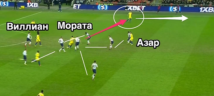 Нельзя не посмотреть и на третий гол хозяев под микроскопом. Начиналось все с того же, что и обычно: теперь уже Азар воткнулся в стену в центре поля.