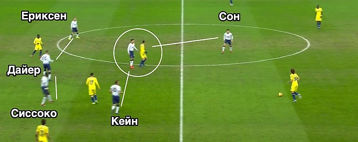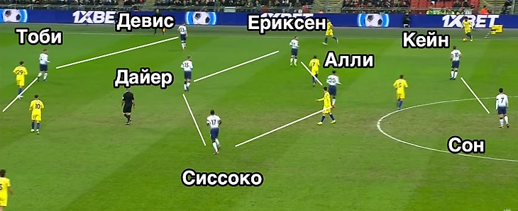 Сон и Кейн выступили в ролях чистых нападающих, практически полностью освобожденных от защитных обязанностей. В то же время Эриксен был отправлен в тройку опорных полузащитников и должен был по полной пахать на два фронта.