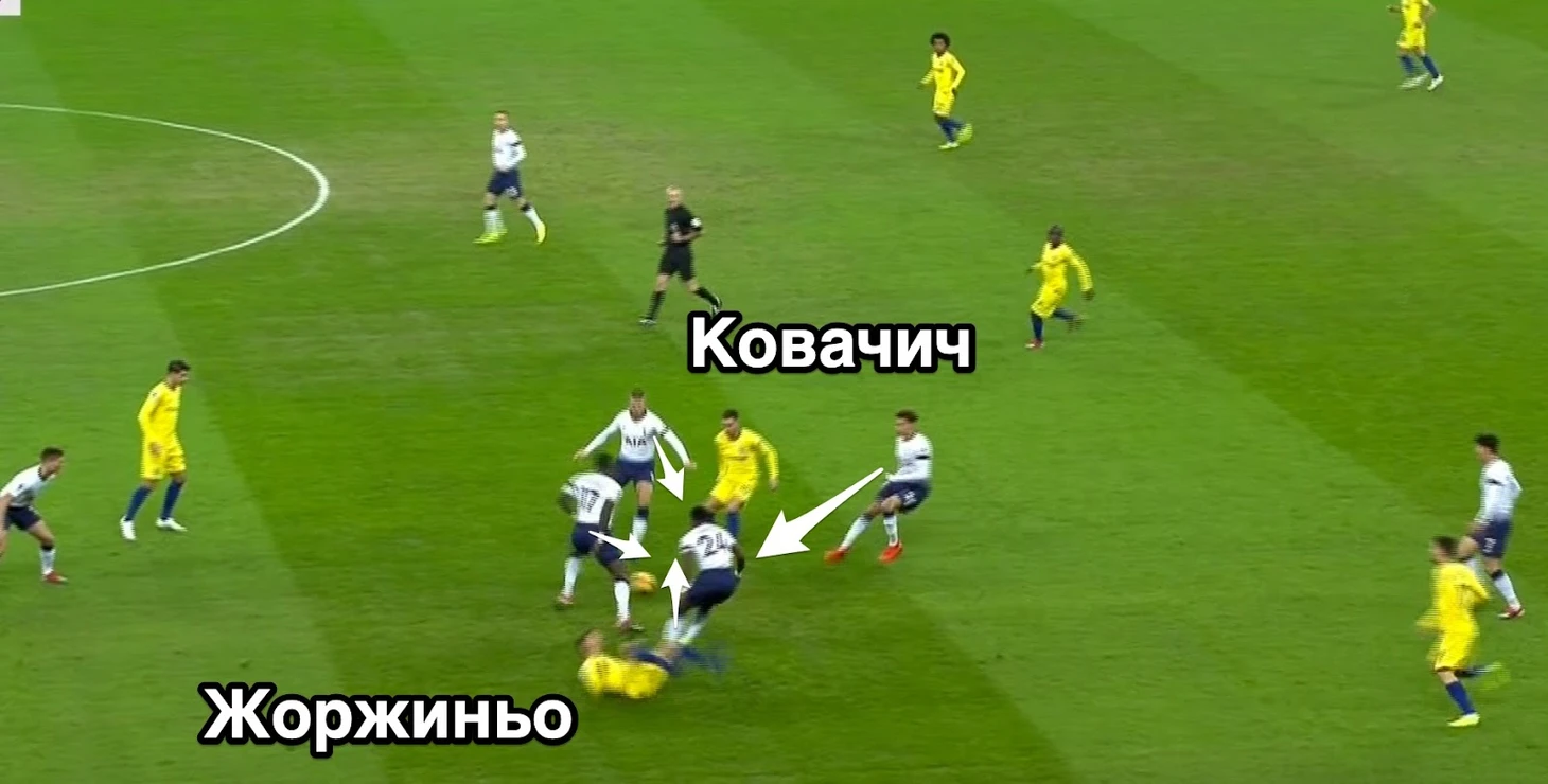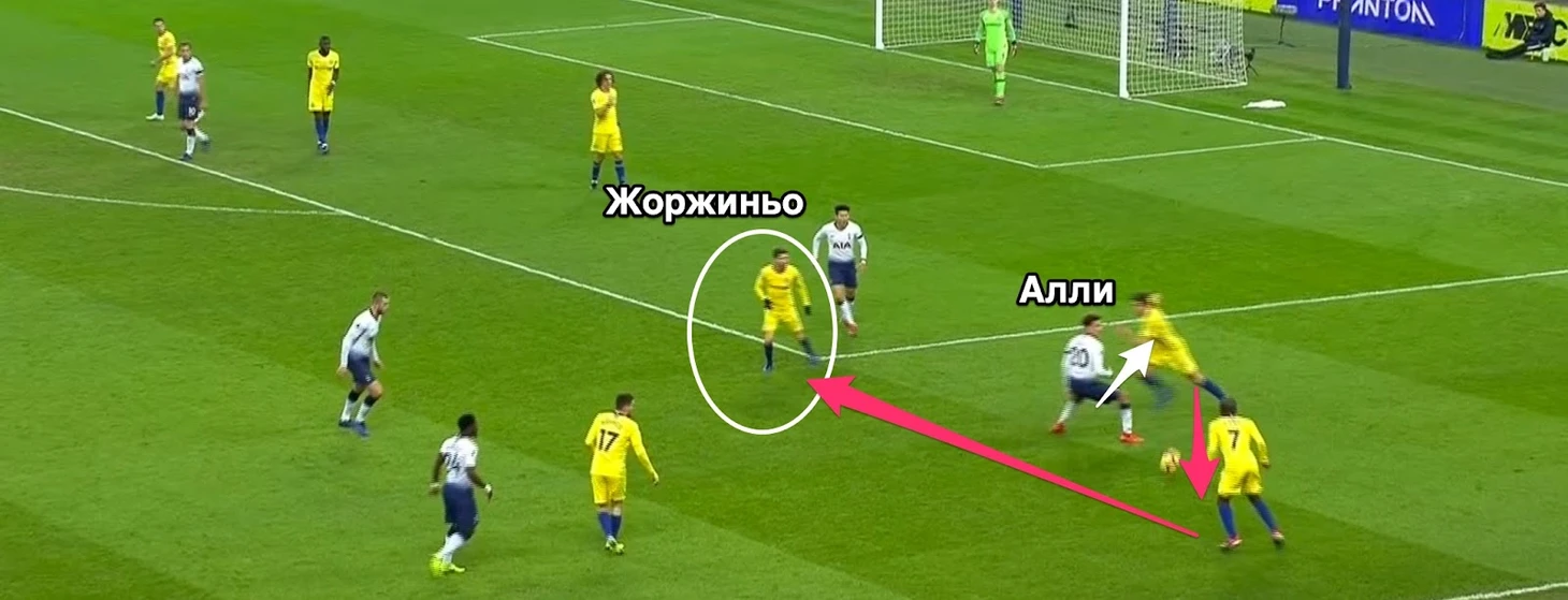 В итоге Жоржиньо получил огромный кусок оперативного пространства для принятия решений, но не сумел придумать действительно острого решения. «Тоттенхэм» быстро вернул себе мяч, а про мелкую помарку Алли все быстро забыли.