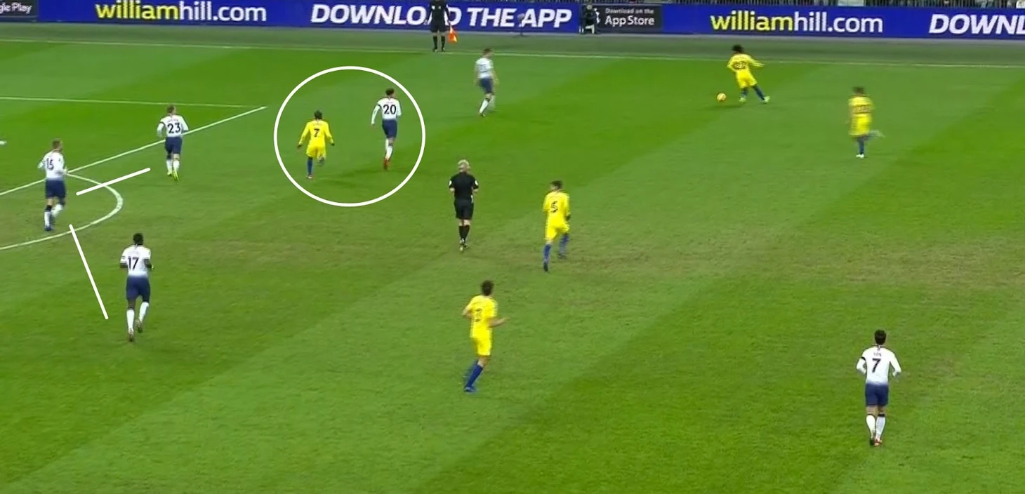 Но нужно отметить еще то, что роль Алли в защите не заканчивалась на монотонном преследовании Жоржиньо. В ситуациях, когда хозяева уже сильно прижимались к своим воротам, Деле не стеснялся помогать своим друзьям. В этом эпизоде Алли опускается за Канте, бросая Жоржиньо.