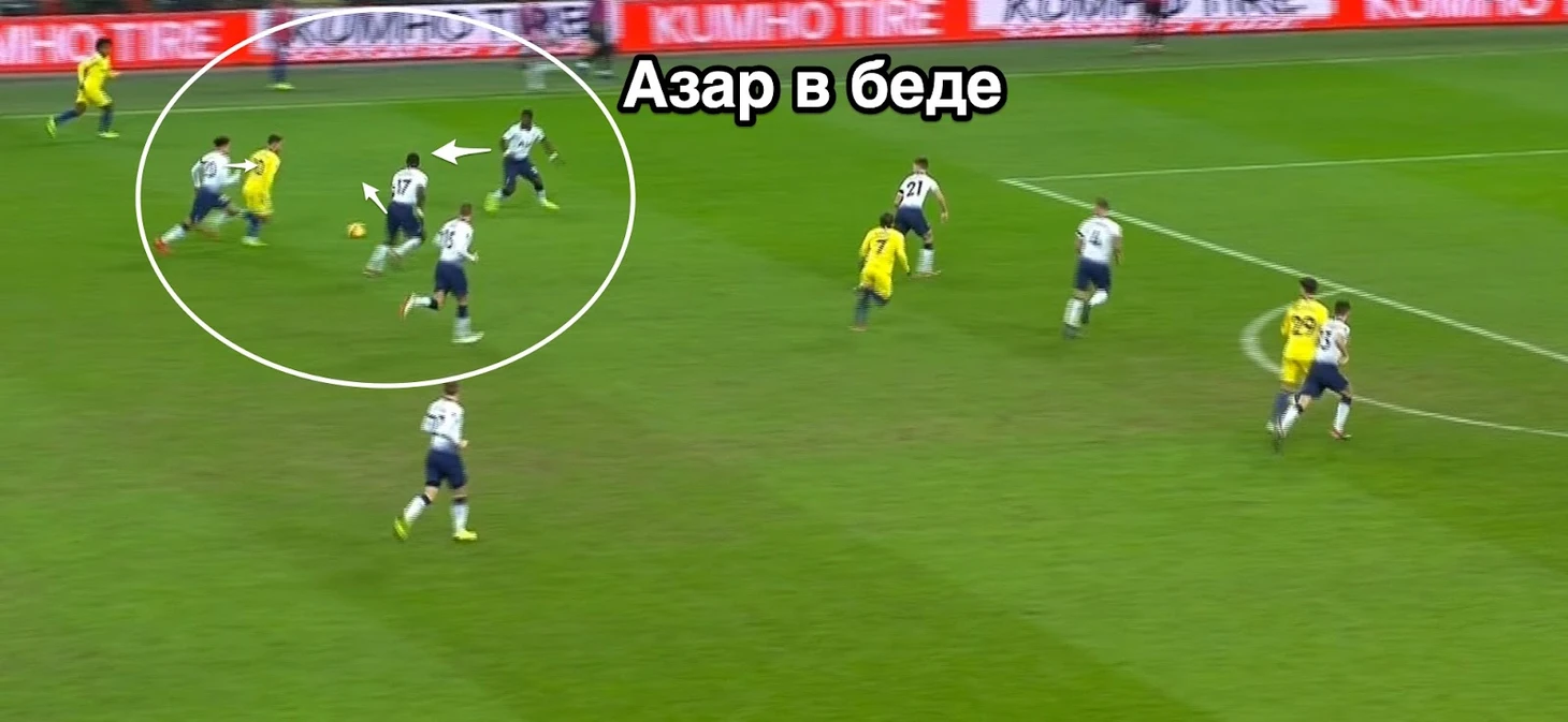 А в этом эпизоде он уже прибежал пугать Виллиана, пока его команда отходит максимально низко. Согласитесь, было бы смертельно опасно, если сразу три игрока «шпор» были бы изолированы от позиционной защиты? Почеттино тоже так думает.
