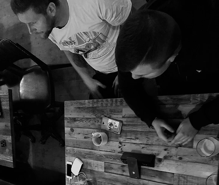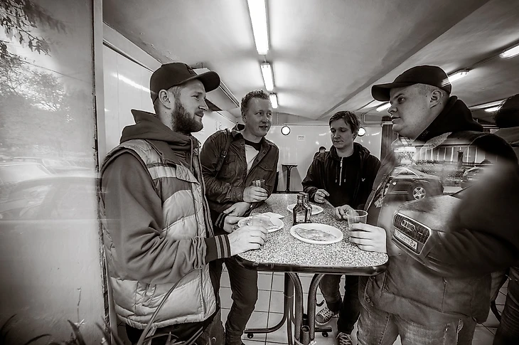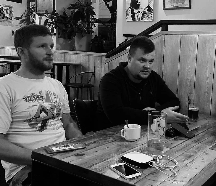 Сергей Диких и Саша Борода, оба на кэжуале, оба активные фанаты (Сергей – за ЦСКА, Саша – за «Локомотив») ждали нас в одном из своих баров в центе Москвы – в заведении, которое называется «Широкую на широкую». Заказали по пинте пенного и понеслась…