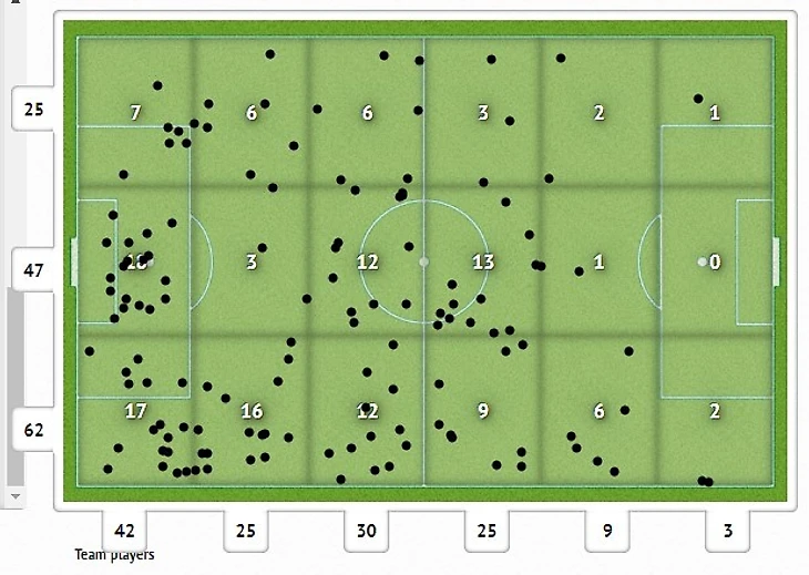 Карта передач Джикии. Видно, в какой широкой позиции Джикия начинал большинство атак