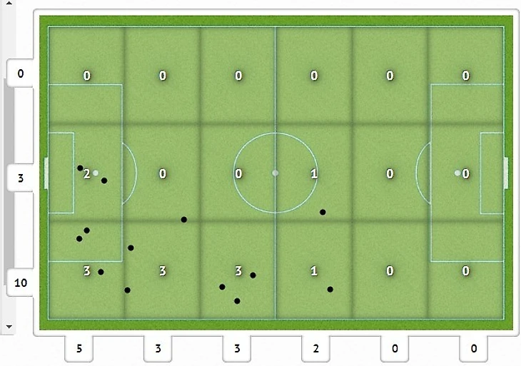 Карта оборонительных единоборств и перехватов «Спартака» в матче с самарцами. Видно, что большинство активных оборонительных действий москвичей – в правых зонах защиты, наиболее активной зоне атаки «Крыльев» (47 атак слева, 24 в центре, 20 справа у самарцев)